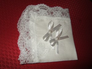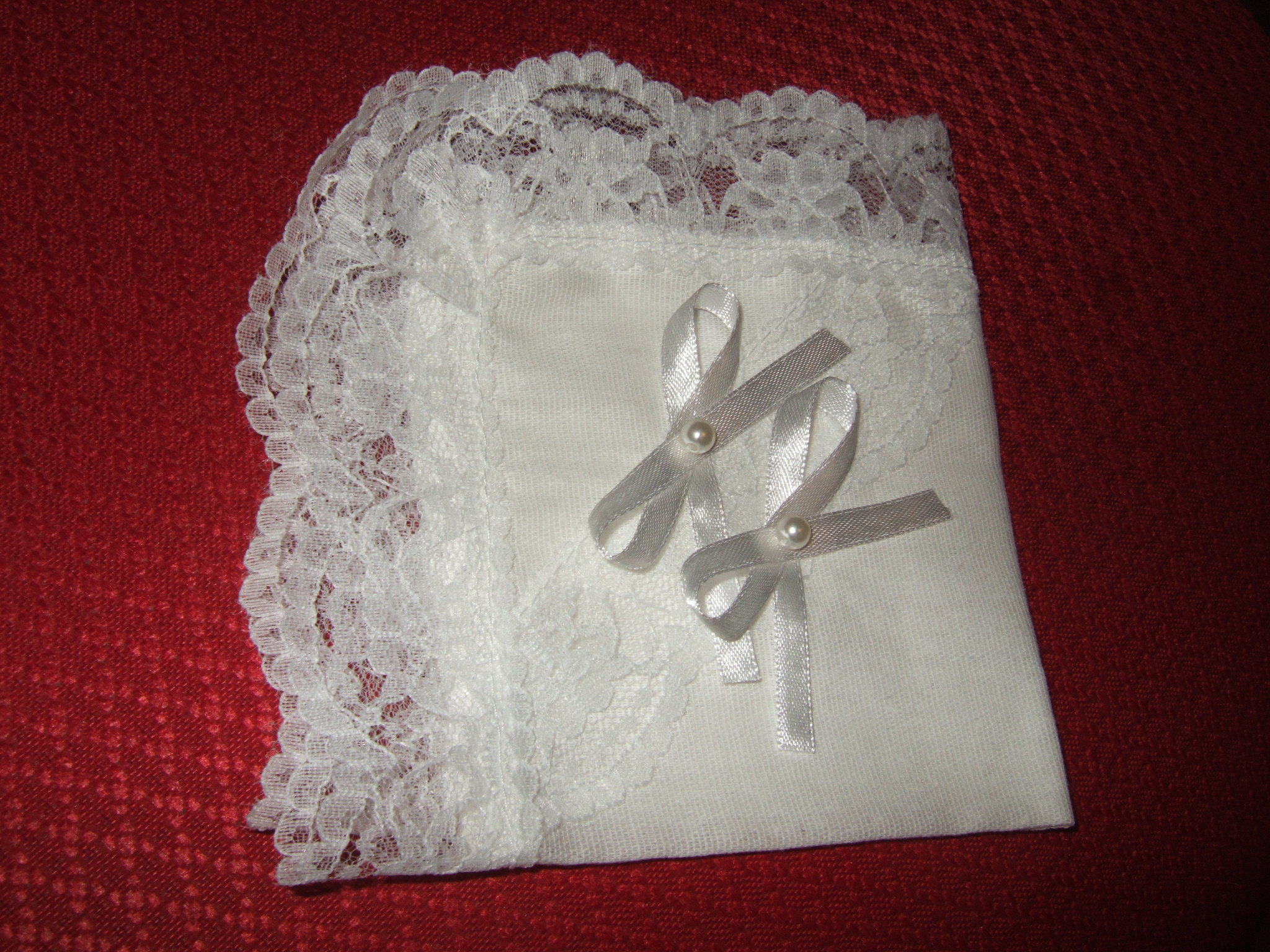 В месте стыка кружевной полоски аккуратно загнуть края, заутюжить и закрепить нитками. В завершении работы можно украсить края платочков бантиками из атласной ленты и белыми бусинками, имитирующими жемчуг.