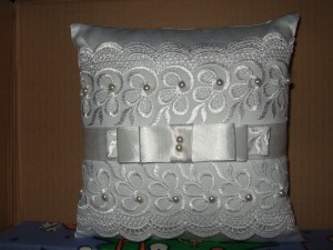 Вывернув атласный верх, наденьте его на основу подушки. После того потайными стежками зашейте отверстие. Атласная подушечка для колец готова!