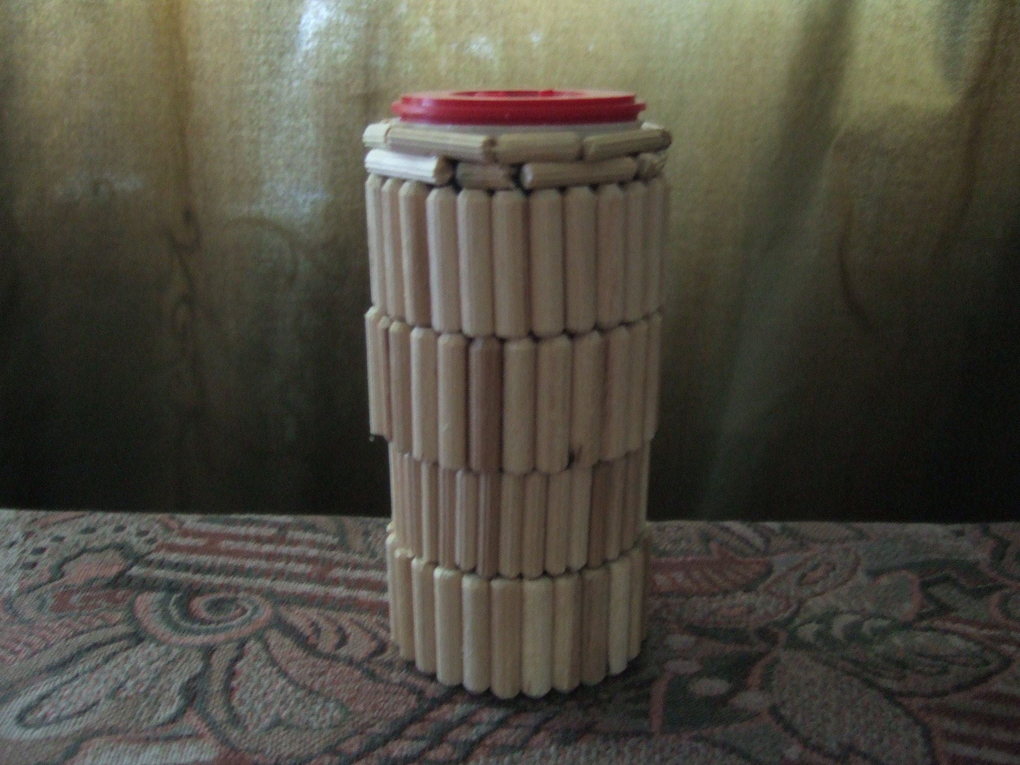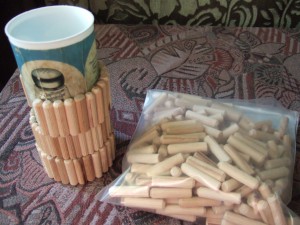 Очищенную солонку с обезжиренной поверхностью необходимо обклеить шкантами по кругу. Брусочки при этом нужно укладывать строго параллельно и плотно друг к другу. Клей лучше использовать прозрачный, в нашем случае это был «Момент-кристалл». Шканты можно приобрести в любом строительном или хозяйственном магазине. Стоят они не дорого, бывают разных размеров и придают изделию приятный, уютный вид. Кстати, после того, как подсохнет клей, солонку можно покрасить золотой, серебряной или любой другой краской.