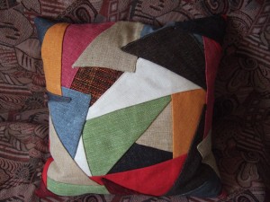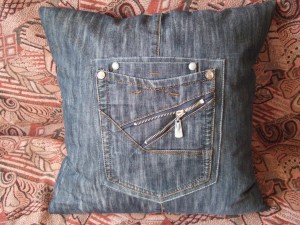 Создание этой подушечки не отличается принципиально ничем от создания всех других диванных подушек или думок. Особенностью является то, что для пошива можно использовать уже не новые потертые брюки — джинсы и кусочки мебельных тканей, оставшиеся после обивки дивана или кресла.
