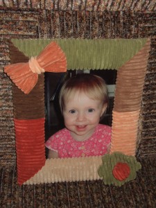 Для того, чтобы придать рамке нарядный и игривый вид, необходимо ее дополнительно чем-то украсить. В нашем случае это объемные бант и цветок, выполненные из разноцветного вельвета и пришитые по углам рамочки.